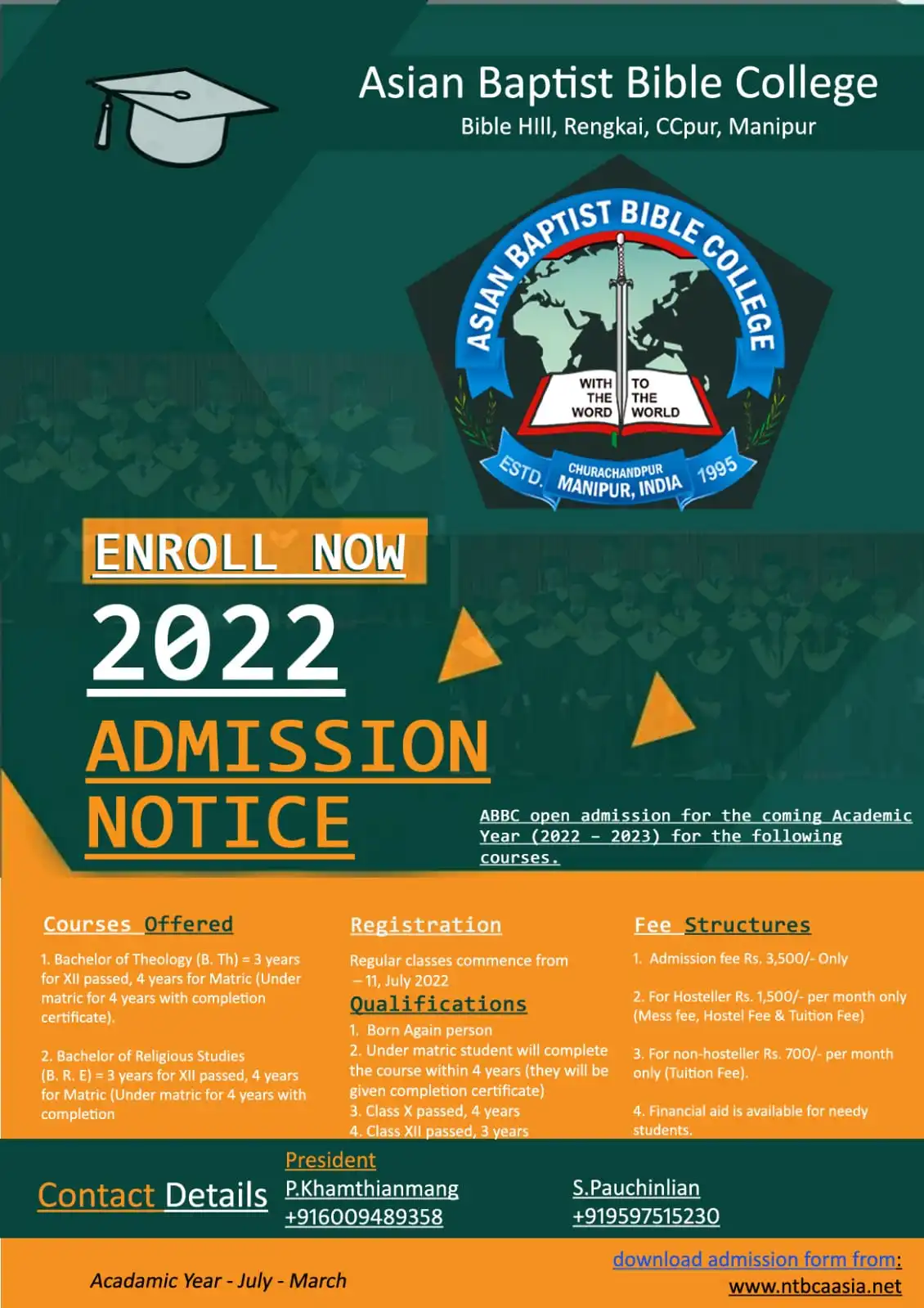 Asian Baptist Bible College & Seminary has been in existence for the past twenty-four years since 1994. It was started by few committed men of God who had a vision to run the college and seminary for equipping and shapping people who are called by God for His glorious ministry. It was begun in the vernacular but closed down due to ethnic clash in the year 1997 and re-opened in 2005 in English medium. Ever since from the inception, there are more than 90 alummi who are working in different parts of India and its neighboring countries like Nepal, Burma.etc.